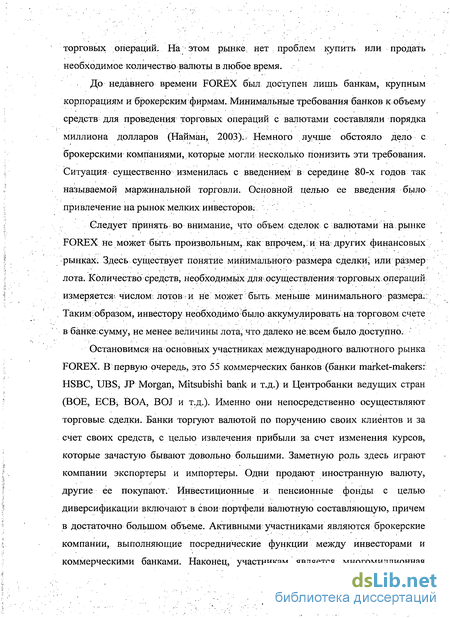 Как уже отмечалось до недавнего времени FOREX был доступен лишь банкам, крупным корпорациям и брокерским фирмам. Минимальные требования банков к объему средств, для проведения торговых операций с валютами составляли порядка миллиона долларов. Ситуация изменилась с введением в середине 1980-х годов маржинальной торговли (margin trading), основанной на том, что объем сделок с валютами на рынке FOREX не может быть произвольным, как впрочем, и на других финансовых рынках (Суворов, 1999). Здесь существует понятие минимального размера сделки или размер лота. Количество средств, необходимых для осуществления торговых операций измеряется числом лотов и не может быть меньше минимального размера, маржинальной торговли появилась возможность размещать на счете лишь часть необходимых средств, в качестве страхового залога, который в десятки и даже сотни раз меньше величины лота. Проводя торговые операции по поручению клиента, банк кредитует его на недостающую сумму, предоставляя, так называемое, кредитное плечо (leverage). Величина этого плеча не стандартизована и обычно равна 100.