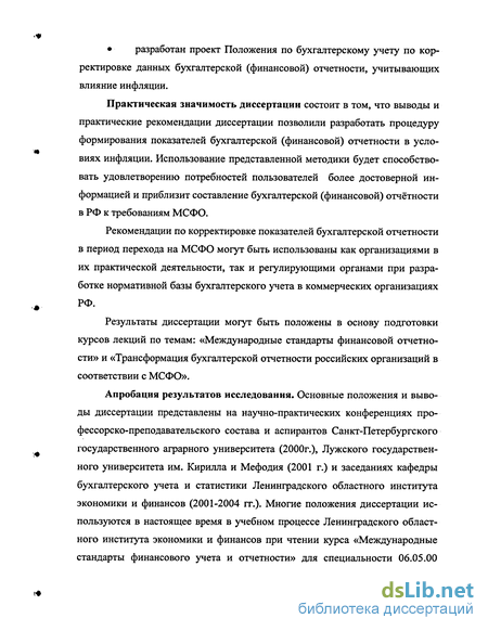 Апробация результатов исследования. Основные положения и выводы диссертации представлены на научно-практических конференциях профессорско-преподавательского состава и аспирантов Санкт-Петербургского государственного аграрного университета (2000г.), Лужского государственного университета им. Кирилла и Мефодия (2001 г.) и заседаниях кафедры бухгалтерского учета и статистики Ленинградского областного института экономики и финансов (2001-2004 гг.). Многие положения диссертации используются в настоящее время в учебном процессе Ленинградского областного института экономики и финансов при чтении курса «Международные стандарты финансового учета и отчетности» для специальности 06.05.00