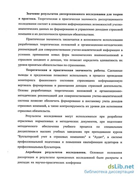 Значение результатов диссертационного исследования для теории и практики. Теоретическая и практическая значимость диссертационного исследования состоит в повышении информационных возможностей учетно-аналитических данных по формированию и управлению доходами страховой компании и их достаточности принятым обязательствам.