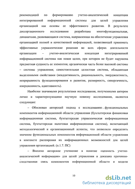 Предложенная в диссертационном исследовании учетно-аналитическая концепция интегрированной информационной системы для целей управления организацией представляет собой дальнейшее развитие теоретических и методологических подходов, представленных в работах вышеуказанных авторов.