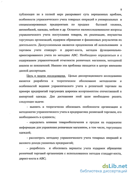 8 публикации не в полной мере раскрывают суть нерешенных проблем, особенности управленческого учета товарных операций в универсальных и специализированных предприятиях по продаже бытовой техники, автомобилей, одежды, мебели и др. Остаются малоисследованными вопросы управленческого учета поступления товаров, их реализации, имущества торгующих организаций, издержек обращения и финансовых результатов их деятельности. Дискуссионными являются предложения об использовании в торговом учете стандарт- и директ-коста, методов функционально-ориентированного учета по методике ABC. Необходимо определиться и с содержанием управленческой отчетности розничных магазинов, методикой анализа ее показателей. Именно эти проблемы находятся в центре внимания данной диссертации.