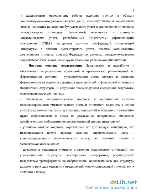 Предмет и объект исследования. Предметом исследования является теоретическое и методическое обеспечение и способы совершенствования учетно-аналитического отражения доходов и расходов консолидированной группы предприятий, в системе управленческого учета, являющихся информационной основой составления консолидированной финансовой отчетности. Объектом исследования являются холдинговые структуры Российской Федерации, процессы их создания и функционирования, а также взаимоотношение компаний - участников группы.