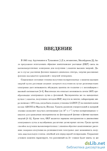 Современное состояние техники получения 7-квантов высоких энергий путем обратного комптоновского рассеяния (ОКР) мощного лазерного излучения на пучке релятивистских электронов дает возможность обсуждать проекты по созданию 7~7 коллайдеров с высокой светимостью. Фактически это означает возможность почти 100% преобразования электронного пучка в фотонный. Эксперименты же на выведенных пучках 7-квантов, полученных методом ОКР, ведутся во многих лабораториях мира начиная с 1978 года, когда была создана установка LADON на накопительном кольце ADONE во Фраскати, Италия. Уровень развития ускорительной и лазерной техники позволяет получать интенсивные (до 107 7 с_1) пучки поляризованных 7-квантов для проведения экспериментов по фотоядерной физике и физике высоких энергий. Кроме того, ОКР является хорошим инструментом в диагностике электронного пучка и калибровках различных детекторных систем. Среди прочих способов получения высокоэнергетичных 7-квантов обратное комптонов-ское рассеяние лазерного излучения на релятивистских электронах дает возможность получить максимальную степень линейной или циркулярной поляризации. Сохранение углового момента гарантирует, что рассеянный на 2л" 7-квант будет иметь ту же поляризацию, что и начальный фотон до рассеяния. В противоположность тормозному излучению, в энергетическом спектре ОКР значительная часть сечения рассеяния сосредоточена вблизи максимальной энергии.