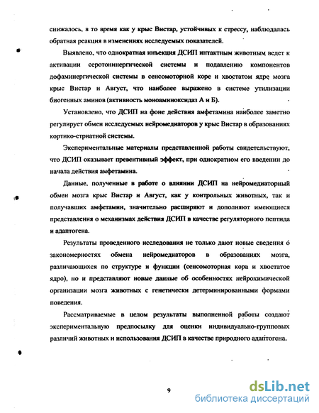 влияние пептида на моноаминергические медиаторные системы мозга животных, что имеет большое значение, учитывая важную роль биогенных аминов в механизмах формирования психопатологических состояний. Действие ДСИП наиболее выражено при функциональных нарушениях, являясь фактором внутреннего подкрепления (Доведова Е. Л., Монаков М. Ю., 1998; Shandra A. A., Godlevskii L. S. et all., 1998; Khvatova E. M., Rubanova N. A. et all." 1995).