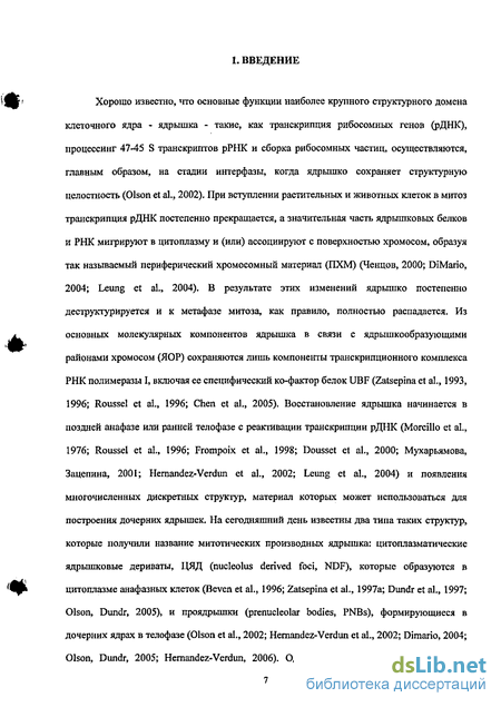 Хорошо известно, что основные функции наиболее крупного структурного домена клеточного ядра - ядрышка - такие, как транскрипция рибосомных генов (рДНК), процессинг 47-45 S транскриптов рРНК и сборка рибосомных частиц, осуществляются, главным образом, на стадии интерфазы, когда ядрышко сохраняет структурную целостность (Olson et al., 2002). При вступлении растительных и животных клеток в митоз транскрипция рДНК постепенно прекращается, а значительная часть ядрьппковых белков и РНК мигрируют в цитоплазму и (или) ассоциируют с поверхностью хромосом, образуя так называемый периферический хромосомный материал (ПХМ) (Ченцов, 2000; DiMario, 2004; Leung et al., 2004). В результате этих изменений ядрышко постепенно деструктурируется и к метафазе митоза, как правило, полностью распадается. Из основных молекулярных компонентов ядрышка в связи с ядрышкообразующими районами хромосом (ЯОР) сохраняются лишь компоненты транскрипционного комплекса РНК полимеразы I, включая ее специфический ко-фактор белок UBF (Zatsepina et al., 1993, 1996; Roussel et al., 1996; Chen et al., 2005). Восстановление ядрышка начинается в поздней анафазе или ранней телофазе с реактивации транскрипции рДНК (МогсШо et al., 1976; Roussel et al., 1996; Frompoix et al., 1998; Dousset et al., 2000; Мухарьямова, Зацепина, 2001; Hernandez-Verdun et al., 2002; Leung et al., 2004) и появления многочисленных дискретных структур, материал которых может использоваться для построения дочерних ядрышек. На сегодняшний день известны два типа таких структур, которые получили название митотических производных ядрышка: цитоплазматические ядрышковые дериваты, ЦЯД (nucleolus derived foci, NDF), которые образуются в цитоплазме анафазных клеток (Beven et al., 1996; Zatsepina et al., 1997a; Dundr et al., 1997; Olson, Dundr, 2005), и проядрышки (prenucleolar bodies, PNBs), формирующиеся в дочерних ядрах в телофазе (Olson et al., 2002; Hernandez-Verdun et al., 2002; Dimario, 2004; Olson, Dundr, 2005; Hernandez-Verdun, 2006). Однако, несмотря на принципиальные различия в локализации и времени формирования, ЦЯД и проядрышки содержат практически одни и те же ядрышковые белки, мякРНК, пре-рРНК, а также имеют сходную фибро-гранулярную ультраструктуру (Dundr et al., 1997, 2000; Dundr, Olson, 1998). Эти данные свидетельствуют в пользу определенного «родства» между ЦЯД и проядрышками.