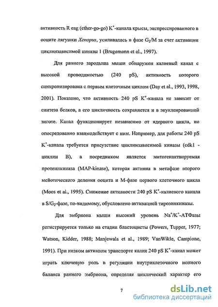 Для раннего зародыша мыши обнаружен калиевый канал с высокой проводимостью (240 pS), активность которого синхронизирована с первым клеточным циклом (Day et al., 1993,1998, 2001). Показано, что активность 240 pS К+-канала не зависит от синтеза белков, а его цикличность сохраняется и в энуклеированной зиготе. Канал функционирует независимо от ядерного цикла, но опосредованно взаимодействует с ним. Например, для работы 240 pS К+-канала требуется присутствие циклинзависимой киназы (cdkl -циклин В), а посредником является митогенактвируемая протеинкиназа (MAP-kinase), которая активна в метафазе второго мейотического деления ооцита и М-фазе первого клеточного цикла (Moos et al., 1995). Снижение активности 240 pS К+-калиевого канала в 8Л32-фазе, по-видимому, обусловлено активацией тирозинкиназы.