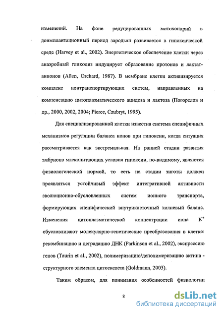 изменений. На фоне редуцированных митохондрий в доимплантационный период зародыш развивается в гипоксической среде (Harvey et al., 2002). Энергетическое обеспечение клетки через анаэробный гликолиз индуцирует образование протонов и лактат-анионов (Allen, Orchard, 1987). В мембране клетки активизируется комплекс ионтранспортирующих систем, направленных на компенсацию цитоплазматического ацидоза и лактоза (Погорелов и др., 2000, 2002, 2004; Pierce, Czubryt, 1995).