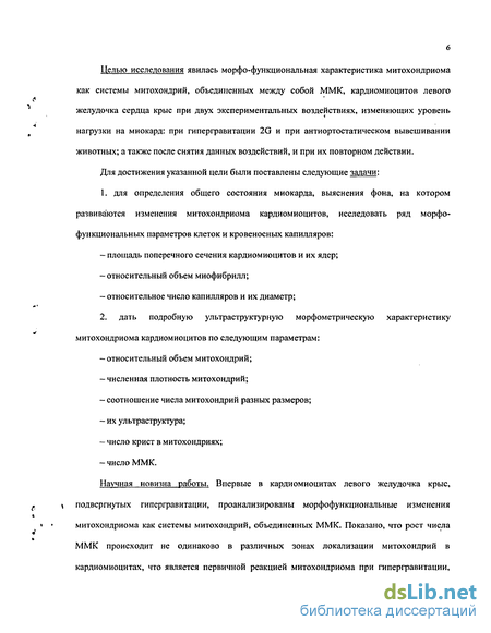 6 Целью исследования явилась морфо-функциональная характеристика митохондриома как системы митохондрий, объединенных между собой ММК, кардиомиоцитов левого желудочка сердца крыс при двух экспериментальных воздействиях, изменяющих уровень нагрузки на миокард: при гипергравитации 2G и при антиортостатическом вывешивании животных; а также после снятия данных воздействий, и при их повторном действии. Для достижения указанной цели были поставлены следующие задачи: