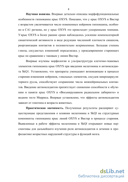 В диссертационной работе проведена оценка возрастных изменений структуры гиппокампа и его функций. Кроме того, изучался нейропротектор-ный потенциал мелатонина и антиоксиданта нового поколения - пластохино-нил-децил-трифенилфосфония, способного проникать и накапливаться в митохондриях.