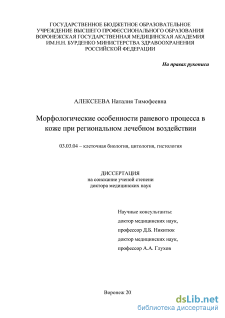 Данная работа содержит фундаментальные данные по проблеме репаративнои регенерации, имеющие большое прикладное значение. В результате проведенного комплексного исследования структурно-функциональных изменений при заживлении кожных ран, на основании планиметрических, морфологических и иммуногистохимических характеристик расширены современные представления о системе репаративнои регенерации в кожных покровах, получены качественные и количественные нормативы, позволяющие унифицировать подход к применяемым биологическим моделям, широко используемых в медико-биологической практике.