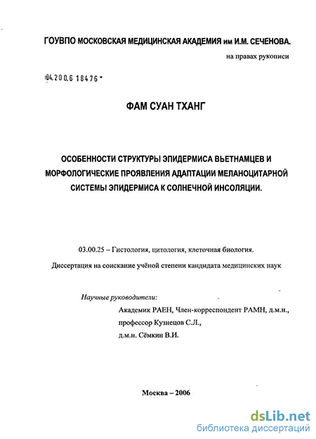 Фам Суан Тханг. Особенности структуры эпидермиса вьетнамцев и морфологические проявления адаптации меланоцитарной системы эпидермиса к солнечной инсоляции : диссертация ... кандидата медицинских наук : 03.00.25 / Фам Суан Тханг; [Место защиты: ГОУВПО "Российский университет дружбы народов"].- Москва, 2006.- 74 с.: ил.