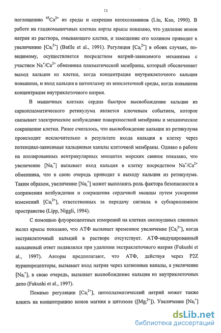 С помощью флуоресцентных измерений на клетках околоушных слюнных желез крысы показано, что АТФ вызывает временное увеличение [Са;2+], когда экстраклеточный кальций в растворе отсутствует. АТФ-индуцированный кальциевый ответ подавлялся при удалении экстраклеточного натрия (Fukushi et al., 1997). Авторы предполагают, что АТФ, действуя через P2Z пуринорецепторы, вызывает вход натрия через катионные каналы, а увеличение [Naj+], в свою очередь, вызывает высвобождение кальция из внутриклеточных депо (Fukushi et al., 1997).