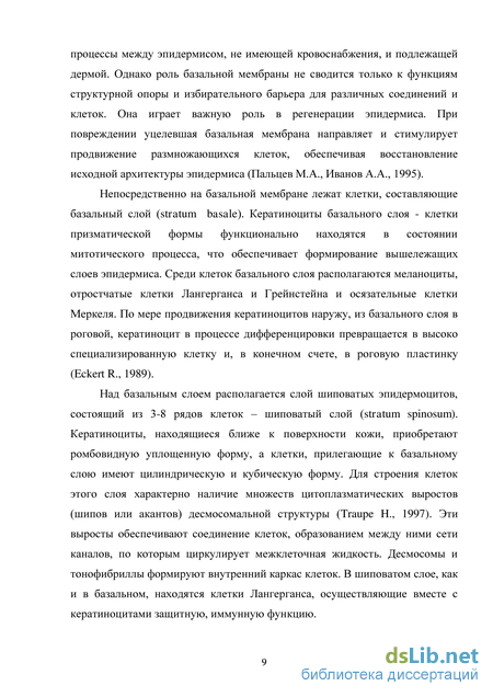 Над базальным слоем располагается слой шиповатых эпидермоцитов, состоящий из 3-8 рядов клеток – шиповатый слой (stratum spinosum). Кератиноциты, находящиеся ближе к поверхности кожи, приобретают ромбовидную уплощенную форму, а клетки, прилегающие к базальному слою имеют цилиндрическую и кубическую форму. Для строения клеток этого слоя характерно наличие множеств цитоплазматических выростов (шипов или акантов) десмосомальной структуры (Traupe H., 1997). Эти выросты обеспечивают соединение клеток, образованием между ними сети каналов, по которым циркулирует межклеточная жидкость. Десмосомы и тонофибриллы формируют внутренний каркас клеток. В шиповатом слое, как и в базальном, находятся клетки Лангерганса, осуществляющие вместе с кератиноцитами защитную, иммунную функцию. Наличие митозов в клетках базального и шиповатого слоев позволяет объединить их в единый ростковый слой эпидермиса (мальпигиев слой).