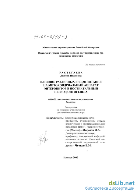 Растегаева Любовь Ивановна. Влияние различных видов питания на митохондриальный аппарат энтероцитов в постнатальный период онтогенеза : диссертация ... доктора биологических наук : 03.00.25.- Ижевск, 2002.- 524 с.: ил. РГБ ОД, 71 03-3/16-3