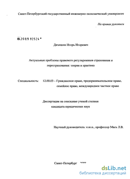 Апробация результатов исследования. Диссертация обсуждалась и была одобрена на заседаниях кафедры гражданского права и гражданского процесса и кафедры государственного и административного права факультета права и экономической безопасности СПбГИЭУ. Основные научные положения отражены в опубликованных работах автора. Результаты диссертационного исследования использовались в учебной работе, при чтении курса по страховому праву в СПбГИЭУ; а также нашли отражение в докладах, сделанных на научно-практических конференциях, в том числе на пленарном заседании межвузовской научно-практической конференции «Проблема правового регулирования товарного и финансового рынка: теория и практика» (12-13 апреля 2006г., СПбГИЭУ).