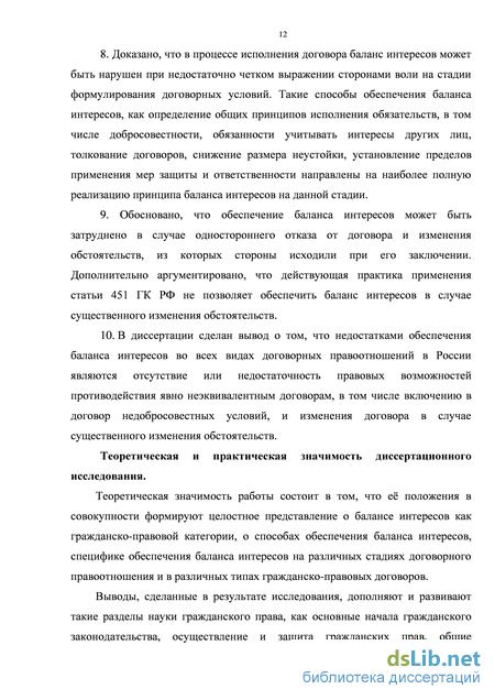 Теоретическая значимость работы состоит в том, что её положения в совокупности формируют целостное представление о балансе интересов как гражданско-правовой категории, о способах обеспечения баланса интересов, специфике обеспечения баланса интересов на различных стадиях договорного правоотношения и в различных типах гражданско-правовых договоров.