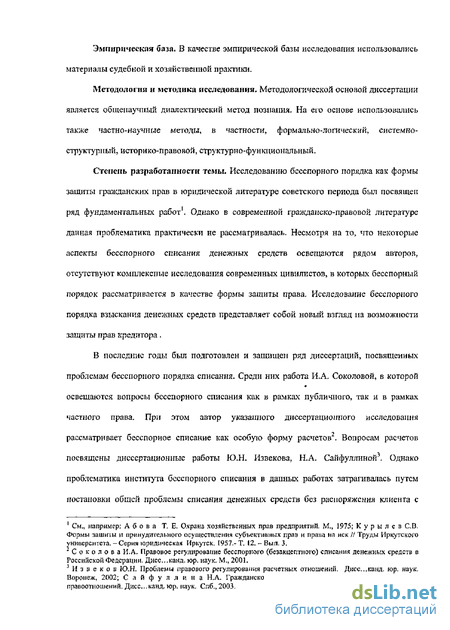 Степень разработанности темы- Исследованию бесспорного порядка как формы защиты гражданских прав в юридической литературе советского периода был посвящен ряд фундаментальных работ1. Однако в современной гражданско-правовой литературе данная проблематика практически не рассматривалась. Несмотря на то, что некоторые аспекты бесспорного списания денежных средств освещаются рядом авторов, отсутствуют комплексные исследования современных цивилистов, в которых бесспорный порядок рассматривается в качестве формы защиты права. Исследование бесспорного порядка взыскания денежных средств представляет собой новый взгляд на возможности защиты прав кредитора.