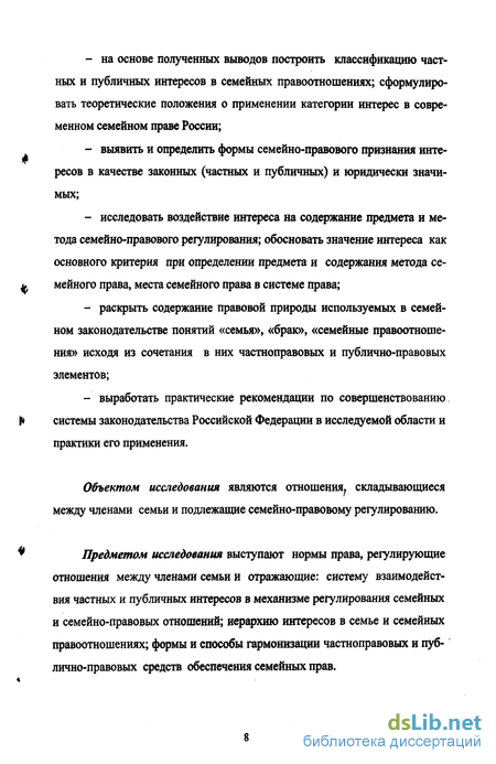 Целью настоящего исследования является разработка теории интереса в семейном праве, учения о роли и месте частных и публичных интересов в механизме семейно-правового регулирования; определение тенденций развития российского семейного права и законодательства.