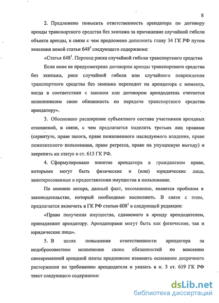 аренды транспортного средства без экипажа за причинение случайной гибели объекта аренды, в связи с чем предложено дополнить главу 34 ГК РФ путем внесения новой статьи 6481 следующего содержания: