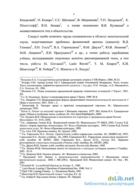 Следует особо отметить труды специалистов в области экономической науки, затрагивающие проблемы финансовой аренды (лизинга): В.Д. Газмана, Л.И. Гехта, В.А. Горемыкина, В.М. Джухи, Ю.В. Леонова, М.И. Лещенко, Л.Н. Прилуцкого и др., а также работы зарубежных учёных, исследовавших отдельные аспекты рассматриваемой темы, в том числе, работы M. Giovanoli, Laslo Reczei, Т. М. Кларка, К.И. Шпиттлера, В. Хойера, С. Жамена и Л. Лакура.