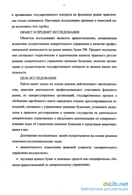 Объектом исследования являются правоотношения, возникающие вследствие осуществления доверительного управления в качестве профессиональной деятельности на рынке ценных бумаг РФ. Предмет исследования составляют теоретические и практические аспекты правового регулирования доверительного управления ценными бумагами, включая организацию и осуществление государственного контроля за данным видом деятельности.