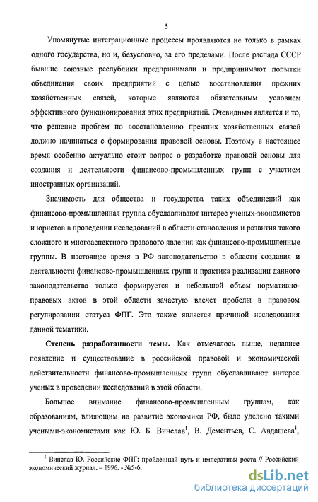 Большое внимание финансово-промышленным группам, как образованиям, влияющим на развитие экономики РФ, было уделено такими учеными-экономистами как Ю. Б. Винслав1, В. Дементьев, С. Авдашева1,