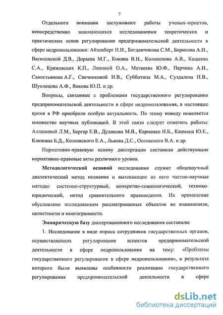 Отдельного внимания заслуживают работы ученых-юристов, непосредственно занимающихся исследованиями теоретических и практических основ регулирования предпринимательской деятельности в сфере недропользования: Н.И. Айзенберг, С.М. Богданчикова, А.Н. Борисова, Д.В. Василевской, М.Г. Дораева, В.Н. Кокина, А.В. Колоколова, С.А. Кощеева, К.П. Кряжевских, О.А. Ляпиной, Ю.Ф. Матвеева, А.И. Перчика, А.Г. Савостьянова, И.В. Свечниковой, М.А. Субботина, И.В. Суздалева, А.Ф. Шуплецова, Ю.П. Янкова и др.