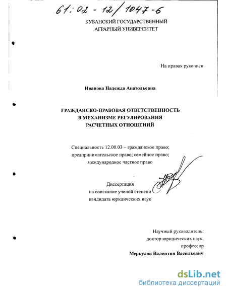 Степень разработанности проблемы. Проблемы гражданско-правовой ответственности (в том числе договорной) за нарушения обязательств в сфере расчетов имеют принципиально важное значение для теории и практики регламентации хозяйственной деятельности любого субъекта гражданского (предпринимательского) оборота, но до сих пор не получили должного комплексного теоретического исследования. Изучение дореволюционных источников показывает, что в творческом наследии русских юристов нет отдельных исследований, посвященных расчетным отношениям, а равно и имущественной ответственности за их нарушения, как самостоятельному и сложному явлению. Тем не менее, существенный вклад в разработку правовой природы денег и денежных обязательств внесли М. Литовченко, Г.Ф. Шершеневич, а в последующем Л.А. Лунц, Л.С. Эльяссон и М.М. Агарков, которые особое внимание уделяли также и вопросам законодательного регулирования банковских операций. В советские времена анализ названных отношений, в том числе расчетных сделок, и порядок применения ответственности в случае их нарушения строился в основном на разграничении административных и гражданских, финансовых и гражданских, гражданских и трудовых правовых элементов либо на основе норм хозяйственного права (И.С. Гуревич, М.Л. Коган, Е.С. Компанеец, В.П. Коряков, В.Ф. Кузьмин, Я.А. Куник, Ф.Х. Либерман, Е.Г. Полонский, Е.С. Флейшиц, P.O. Халфина).