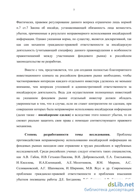 Вместе с тем, представляется, что для создания полностью благоприятного инвестиционного климата на российском фондовом рынке необходимо, чтобы частноправовым интересам каждого отдельного инвестора уделялось не меньшее внимание, чем вопросам уголовной и административной ответственности за инсайдерскую деятельность. Ведь для осуществления полноценных инвестиций на указанном фондовом рынке отдельный инвестор должен обладать уверенностью в том, что в случае, если он станет контрагентом по сделкам, при совершении которых была неправомерно использована инсайдерская информация (далее также – инсайдерские сделки) и вследствие этого понесет убытки, то он сможет реально защитить свои права с помощью соответствующего правового механизма.
