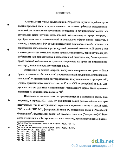 Актуальность темы исследования. Разработка научных проблем гражданско-правовой защиты прав и законных интересов субъектов предпринимательской деятельности на протяжении последних 15 лет продолжает оставаться актуальной темой научных исследований, что связанно, в первую очередь, с преобразованиями в экономической и социальной сферах жизни общества, а именно, с переходом РФ от административно-планового способа ведения хо-зяйственной деятельности к регулируемой рыночной экономике. В связи с чем в законодательстве появились новые правовые институты, ранее научно не разработанные или разработанные в недостаточной степени - так, было признано право частной собственности граждан, закреплено их право на предпринимательскую, инициативную деятельность и т. п.