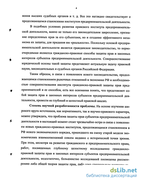 Степень научной разработанности проблемы. На основе изучения широкого круга источников, как нормативного, так и научно-правового характера, можно утверждать, что проблема защиты прав субъектов предпринимательской деятельности в настоящий момент стоит чрезвычайно остро в связи с появлением новых гражданско-правовых институтов, продолжающимся становлением в РФ нового экономического порядка, пришедшего на смену старой модели экономических взаимоотношений совсем недавно с исторической точки зрения. При этом, несмотря на развитие гражданского и предпринимательского права, работ, посвященных глубокому целостному исследованию гражданско-правовой защиты прав и законных интересов субъектов предпринимательской деятельности, недостаточно, большинство исследований посвящены рассмотрению либо общей теории защиты прав, либо узко специальным вопросам за щиты прав предпринимателей, не всегда они успевают и за часто меняющимся законодательством. Существующие исследования характеризуются большой разнородностью и содержат во многом противоречивые выводы. Особую актуальность поэтому приобретает целостное изучение правового института «гражданско-правовой защиты прав и законных интересов субъектов предпринимательской деятельности». Данная работа, как нам представляется, даст дополнительный материал для дальнейших теоретических исследований проблемных вопросов и практики указанного правового института.