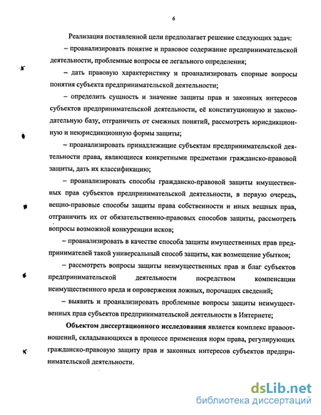 Предметом исследования является совокупность норм современного российского гражданского и предпринимательского права, конституционного права, ведомственные нормативные акты, судебная практика, теоретические и научные воззрения и разработки, касающиеся вопросов защиты прав и законных интересов субъектов предпринимательской деятельности.