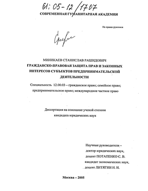 Целью данного исследования является правовой анализ гражданско-правовой защиты прав и законных интересов субъектов предпринимательской деятельности в соответствии с действующим законодательством и правовой доктриной.