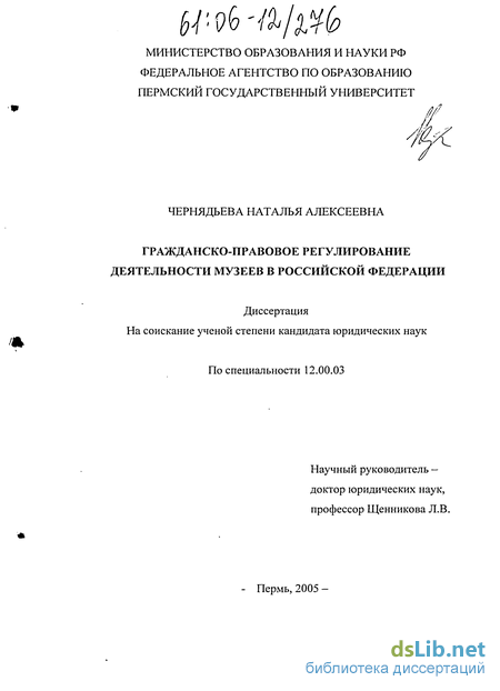 оборота, выделить особенности их гражданско-правового оборота, установить гражданско-правовые способы охраны музейных ценностей; - выявить направления совершенствования гражданского законодательства в музейной сфере, сформулировать предложения по совершенствованию музейного законодательства. Объектом исследования стали правовые отношения в музейной сфере. Предметом работы явились специфические способы участия отечественных музейных организаций в гражданско-правовых отношениях, особенности музейных ценностей как объектов гражданских прав.