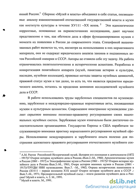 В настоящем исследовании использовались работы по истории музейного дела в России. В работах A.M. Разгон на основе архивных данных анализировался процесс становления музейной сети, формирования официального государственного интереса к сохранению исторического прошлого в дореволюци онной России. Сборник «Музей и власть» объединил в себе статьи, посвященные анализу взаимоотношений отечественной государственной власти и музея как института культуры в течение XVI11 -XX веков. 2 Эти идеологически корректные, основанные на первоисточниках исследования, дают научное представление о том, как обстояли дела в сфере функционирования музеев с момента их появления в России до современного этапа. Спецификой вышеназванных работ является то, что, несмотря на использование в них нормативного материала, они не содержат юридического анализа законов и подзаконных актов Российской империи и СССР. Авторы не ставили себе эту задачу. Их работа ограничивалась политологическими и историческими аспектами. Разработка и конкретизация понятийного аппарата (музей, памятник истории и культуры, наследие, музейная коллекция), правовые методы защиты музейных ценностей, правовой статус музея и так далее, то есть то, что является предметом юридического анализа, осталось за пределами внимания исследователей музейного дела в СССР.