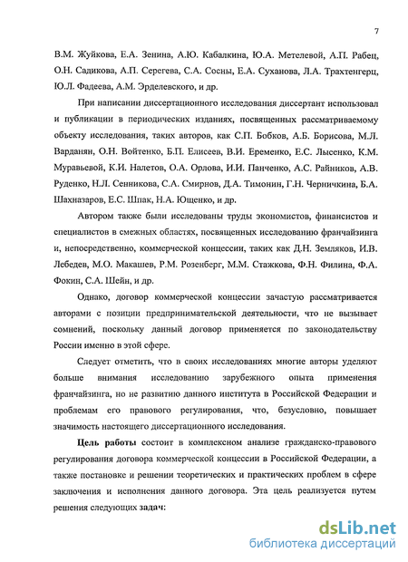 Автором также были исследованы труды экономистов, финансистов и специалистов в смежных областях, посвященных исследованию франчайзинга и, непосредственно, коммерческой концессии, таких как Д.Н. Земляков, И.В. Лебедев, М.О. Макашев, P.M. Розенберг, М.М. Стажкова, Ф.Н. Филина, Ф.А. Фокин, С.А. Шейн, и др.