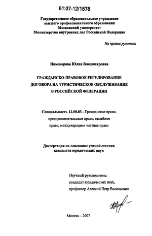 Степень научной разработанности темы. Проблемам правового регулирования туристской деятельности в Российской Федерации был посвящен целый ряд исследований. Среди них необходимо назвать работы по общим вопросам гражданско-правового регулирования туристской деятельности в России (Щенниковой Л.В., Е.ЛПисаревского, Ю.АЛененова, О.В. Тка-ченко и др.).