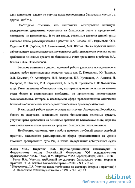 Необходимо .отметить, что системного исследования института распоряжения денежными средствами на банковском счете, в юридической литературе не проводилось. В то же время, отдельные аспекты данной темы наиболее полно рассматриваются в работах В.А. Белова, О.Н. Садикова, СВ. Сарбаш, Л.А. Новоселовой, М.К. Юкова, Ефимовой Л.Г. Очень глубокий анализ действующего законодательства, касающегося действительности уступки права требования денежных средств на банковском счете проводился в работах ВА Белова и ЛА. Новоселовой. .