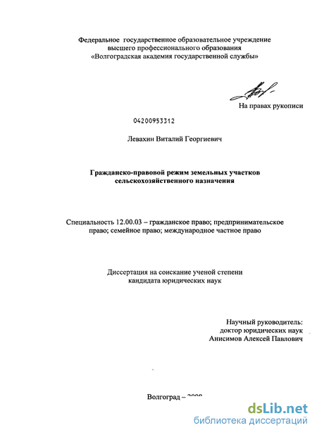 По отдельным аспектам гражданско-правового режима земельных участков сельскохозяйственного назначения в последнее десятилетие были защищены кандидатские диссертации С И Герасина «Правовые основы оборота земель, используемых в сельскохозяйственном производстве» (2000 г), Е Н Никитиной «Правовой режим земель сельскохозяйственного назначения» (2003 г), И Ю Ельцовой «Гражданско-правовое регулирование сделок с землей» (2003 г), Е В Балашова «Правовое регулирование оборота земельных долей в аграрной сфере экономики» (2005 г ), Д В Жернакова «Правовой режим земельных участков как объектов гражданского оборота» (2006 г )