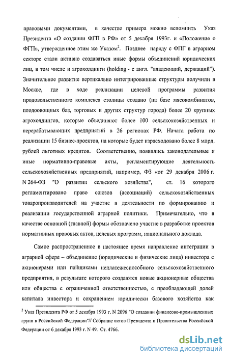 Применительно к теме исследования следует отметить, что формирование агрохолдингов не является абсолютно новым российским явлением. В аграрном секторе России уже в середине 90-х годов прошлого века было немало примеров, когда несельскохозяйственные компании инвестировали сельскохозяйственное производство и создавали вертикально интегрированные производственные структуры. В первые годы после распада СССР агропродовольственные объединения создавались в форме финансово-промышленных групп (ФПГ). По имеющимся данным, на начало 1998 г. Из 46 ФПГ, работавших в России, 17 действовало в сфере АПК, а 8 из них непосредственно занималось сельским хозяйством. Правовое регулирование указанных объединений было предусмотрено несколькими нормативно-