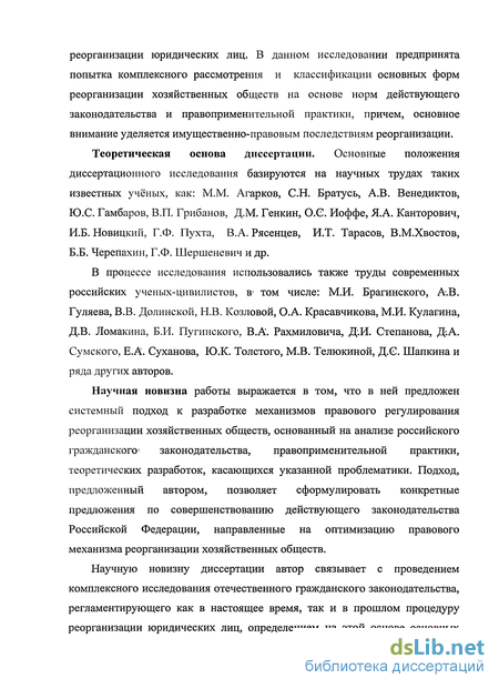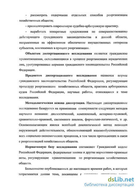 Методологическая основа диссертации. Настоящее диссертационное исследование базируется на применении совокупности следующих методов научного познания: диалектический, комплексный, историко-правовой, сравнительно-правовой, системного анализа, формально-логический, и др. Основополагающим явился всеобщий диалектический метод познания окружающей действительности, обосновывающий взаимообусловленность всех социально-экономических процессов, в том числе протекающих в связи с реорганизацией хозяйственных обществ.