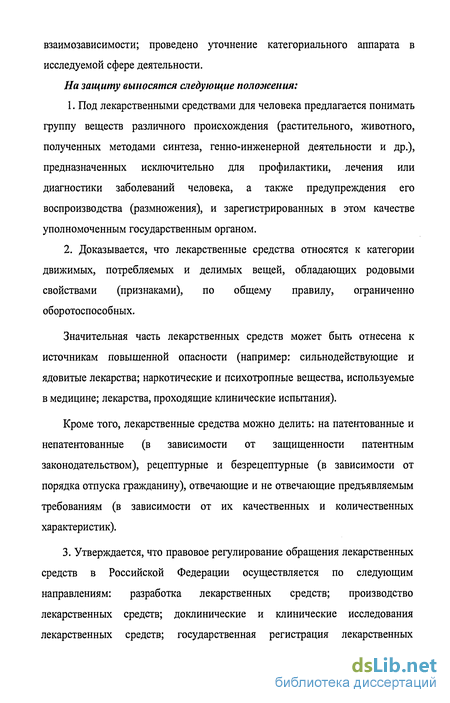 На защиту выносятся следующие положения: 1. Под лекарственными средствами для человека предлагается понимать группу веществ различного происхождения (растительного, животного, полученных методами синтеза, генно-инженерной деятельности и др.), предназначенных исключительно для профилактики, лечения или диагностики заболеваний человека, а также предупреждения его воспроизводства (размножения), и зарегистрированных в этом качестве уполномоченным государственным органом.
