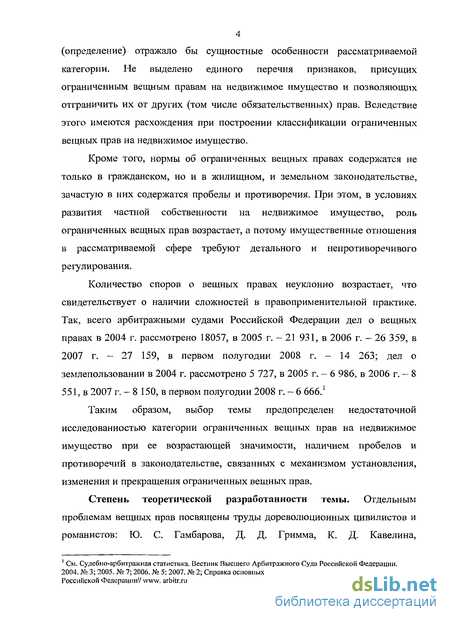 1 См. Судебно-арбитражная статистика. Вестник Высшего Арбитражного Суда Российской Федерации. 2004. № 3; 2005. № 7; 2006. № 5; 2007. № 2; Справка основных показателей работы арбитражных судов Российской Федерации// www. arbitr.ru С. А. Муромцева, Д. И. Мейера, И. А. Покровского, В. И. Синайского, В. М. Хвостова, Г. Ф. Шершеневича и др. В изученных работах рассматриваются ограниченные вещные права на недвижимое имущество, существовавшие в римском праве, дореволюционном российском гражданском праве, они представляют интерес для сравнительно-правового исследования, понимания истоков возникновения ограниченных вещных прав на недвижимое имущество.