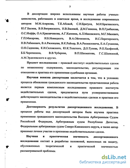 Достоверность результатов диссертационного исследования. В процессе работы над диссертацией автором была изучена практика применения гражданского законодательства Высшим Арбитражным Судом Российской Федерации, Арбитражным судом Республики Дагестан, Федеральным арбитражным судом Северо-Кавказского округа, а также автор принимал личное участие в признании недействительными сделок.