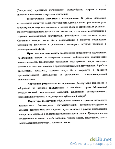 Структура диссертации обусловлена целями и задачами настоящего исследования. Рассмотрение соответствующих теоретико-исторических аспектов недействительности сделок осуществляется в рамках исследования конкретных вопросов в области недействительности сделок. Диссертационное исследование включает в себя введение, четыре главы, заключение, список использованной литературы, концевые сноски.