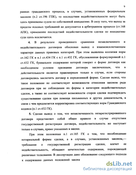4. В результате проведенного сравнения незаключенного и недействительного договоров обоснован вывод о взаимоисключающем характере данных правовых категорий. При этом выявлена коллизия норм ст. 162 ГК и п.1 ст.434 ГК с п.1 ст.432 ГК, обусловленная формулировкой п.1 ст.432 ГК, буквальное содержание которой говорит о форме договора как необходимом условии признания договора заключенным, что в действительности является правомерным только в случае, если стороны договорились заключить договор в определенной форме. Сделан вывод, что такое положение не соответствует возможности отнесения законом ряда договоров при не соблюдении их формы к категории недействительных сделок, а также не соответствует возможности сторон сделки подтверждать существование сделки при помощи письменных и других доказательств, в связи с чем предлагается корректировка соответствующих норм Гражданского кодекса (п.1 ст.432 ГК).