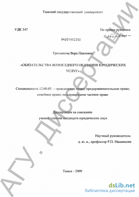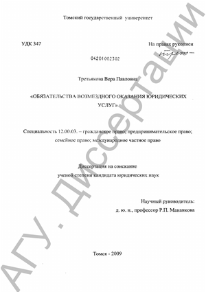 рактическая значимость. Работа содержит конкретные предложения по совершенствованию законодательства, по внесению изменений и дополнений в ряд нормативных актов, в том числе и ГК РФ. Сформулированные в диссертации предложения и выводы направлены на совершенствование законодательства по оказанию юридических услуг. Указанные рекомендации и предложения призваны устранить недостатки и