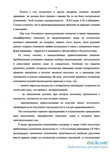 Вместе с тем, существует и другая доктрина, согласно которой завещание не должно быть связано с какими бы то ни было «встречными условиями». Этой позиции придерживаются В.В.Гущин и Ю.А.Дмитриев. Следует отметить, что и правоприменительная практика не признает условий в завещании.