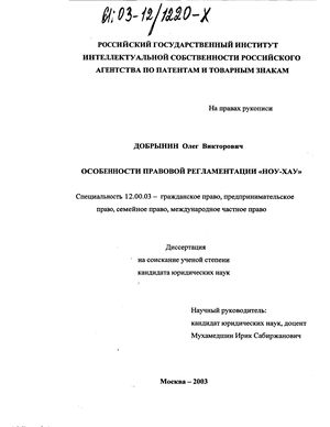 Апробация результатов исследования. Диссертация выполнена на кафедре правовой охраны интеллектуальной собственности Российского государственного института интеллектуальной собственности (РГИИС)