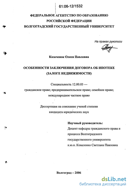договора об ипотеке (залоге недвижимости), автор диссертационного